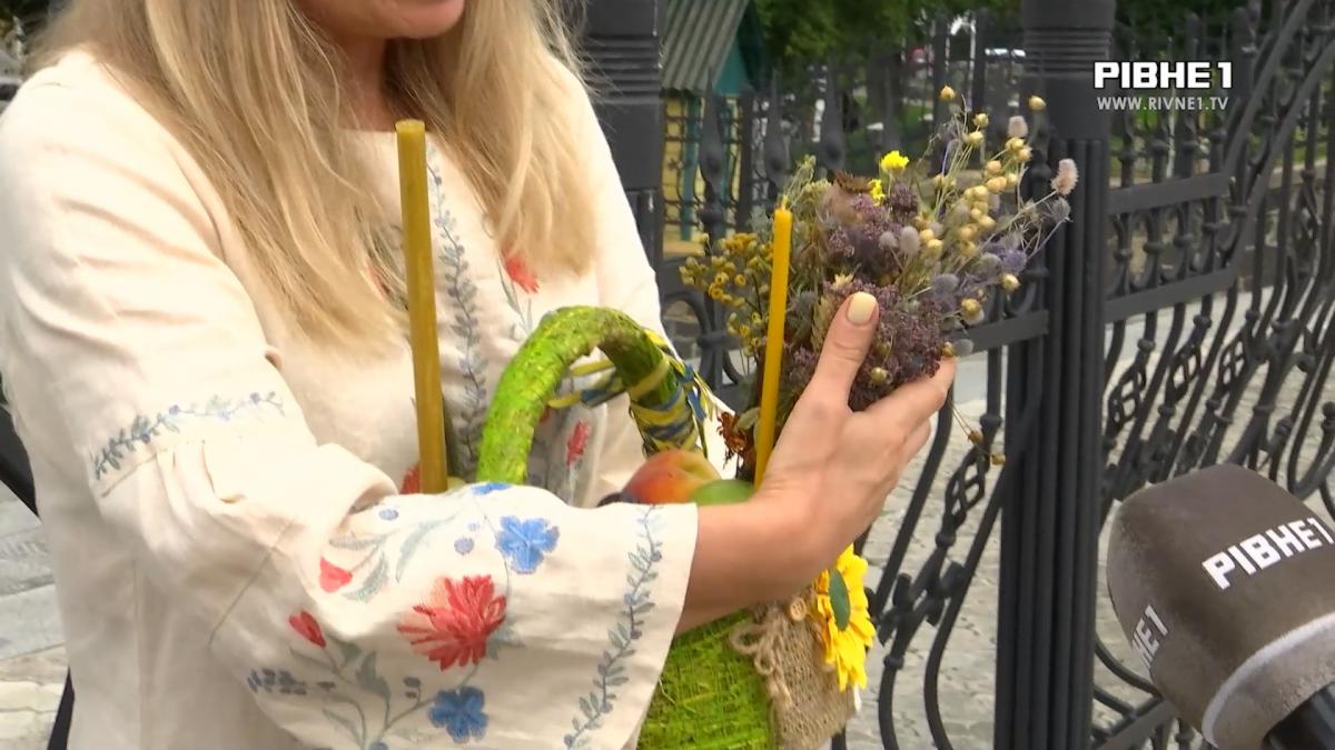 Пані Олена разом з сім'єю прийшла до храму, аби відзначити Яблучний Спас. У кошичок поклала фрукти та квіти, щоб посвятити.