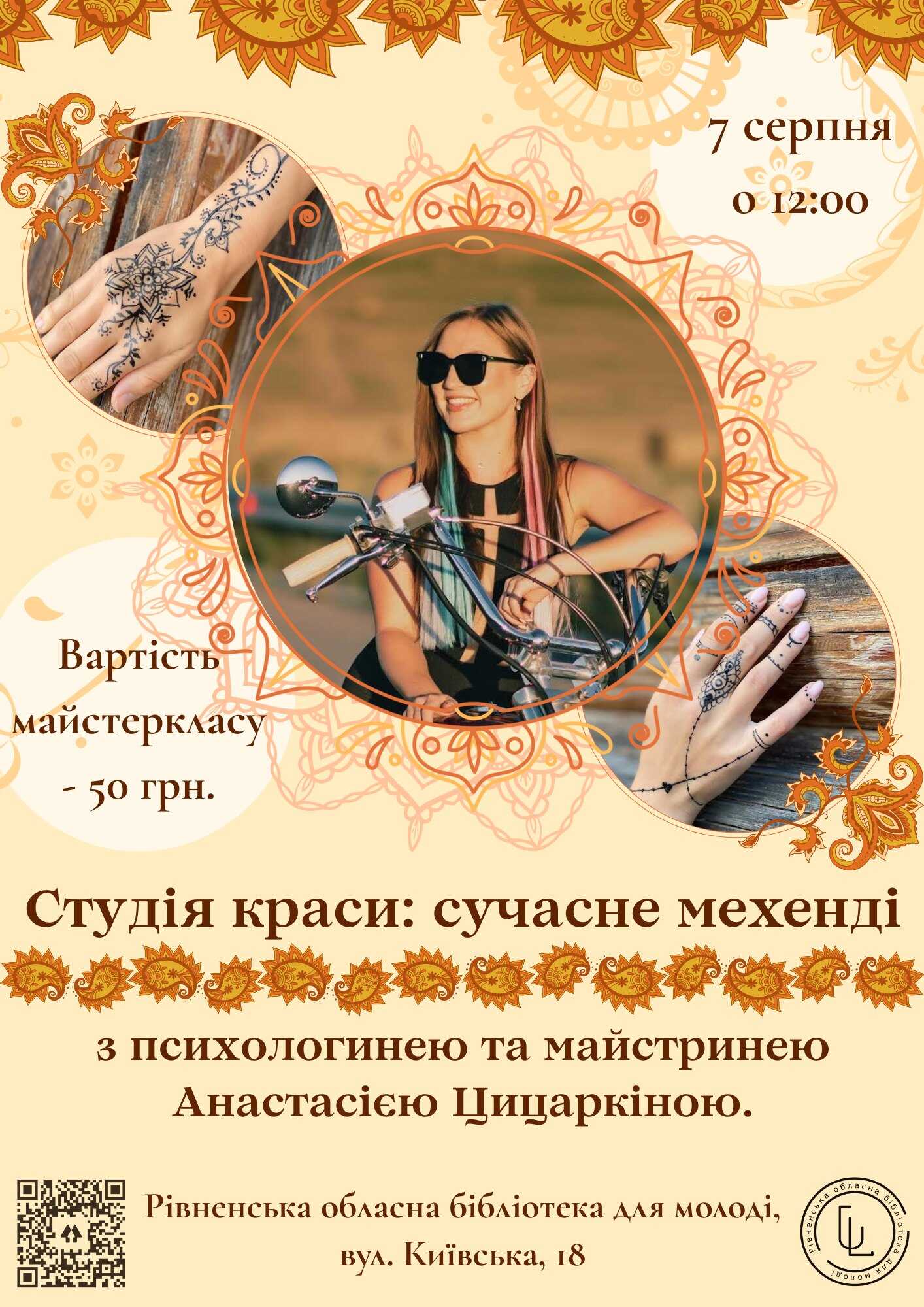 В четвер, 7 серпня о 12 год. у Рівненській обласній бібліотеці для молоді усім охочим проведуть майстер-клас із мехенді.
