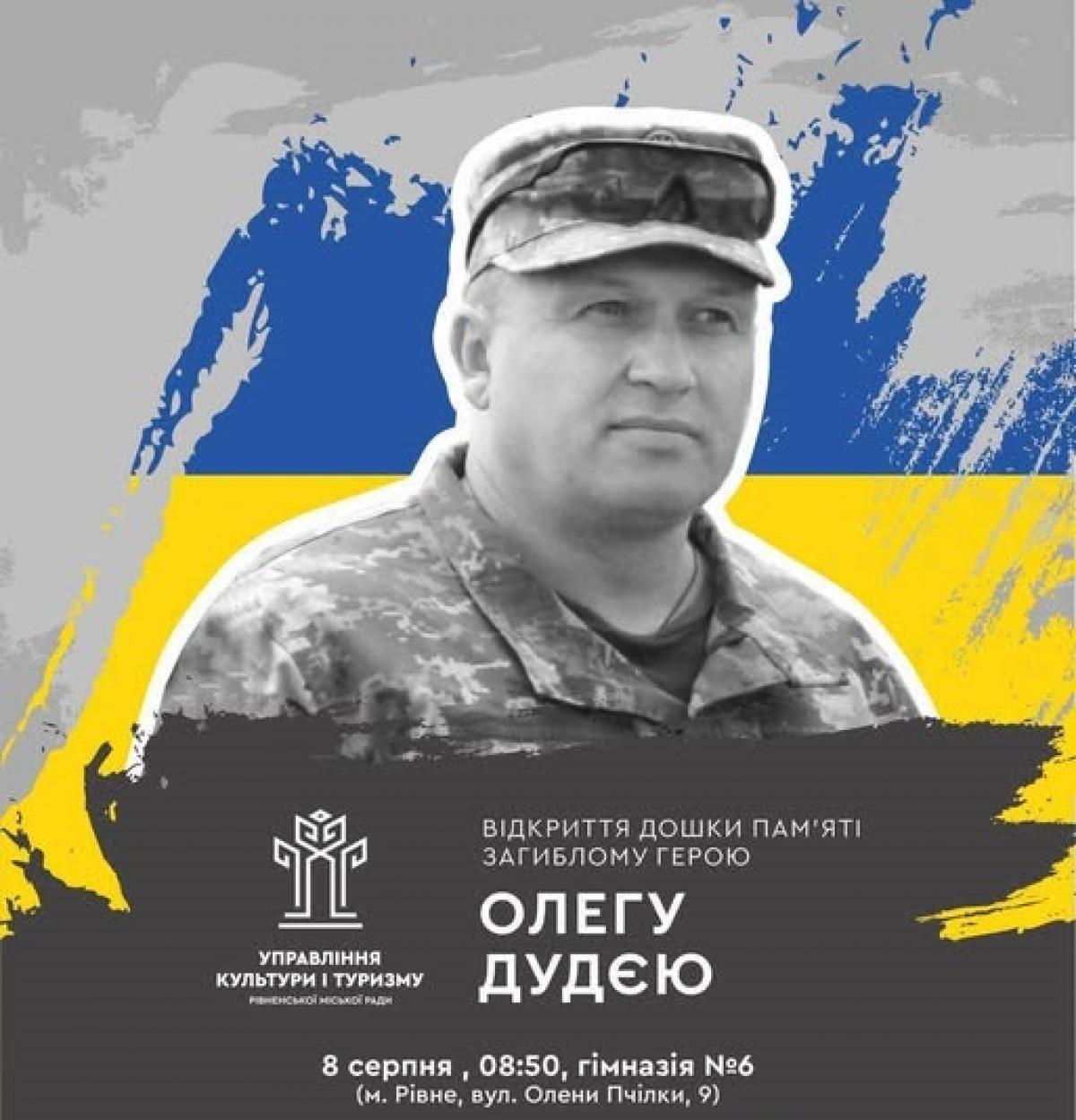 Завтра, 8 серпня, о 8:50, на фасаді Рівненської гімназії №6 відбудеться відкриття дошки пам’яті загиблому Герою Олегу Дудєю.