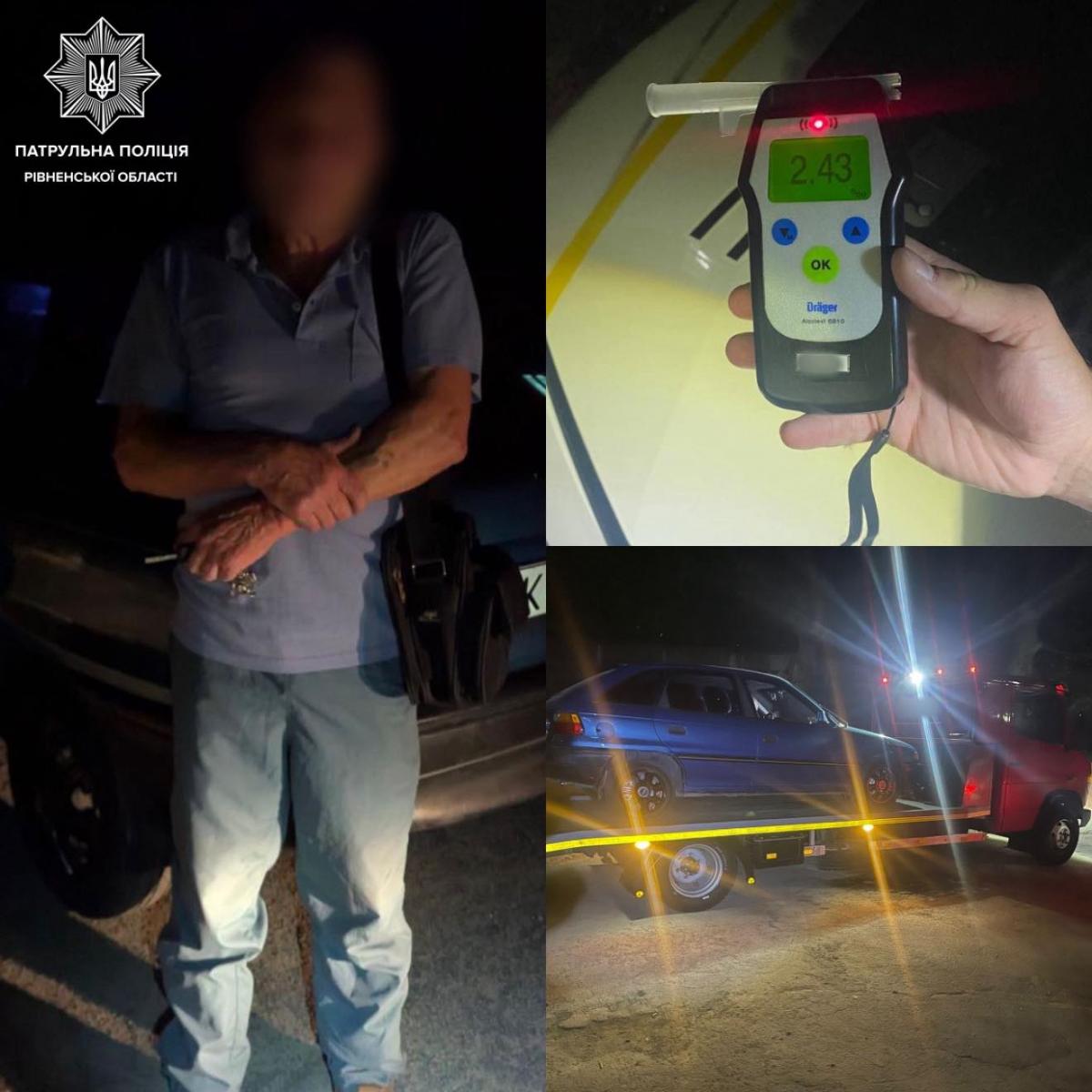 Під час перевірки документів у 57-річного водія виявили ознаки алкогольного сп’яніння. Результат огляду показав 2,43‰ проміле.