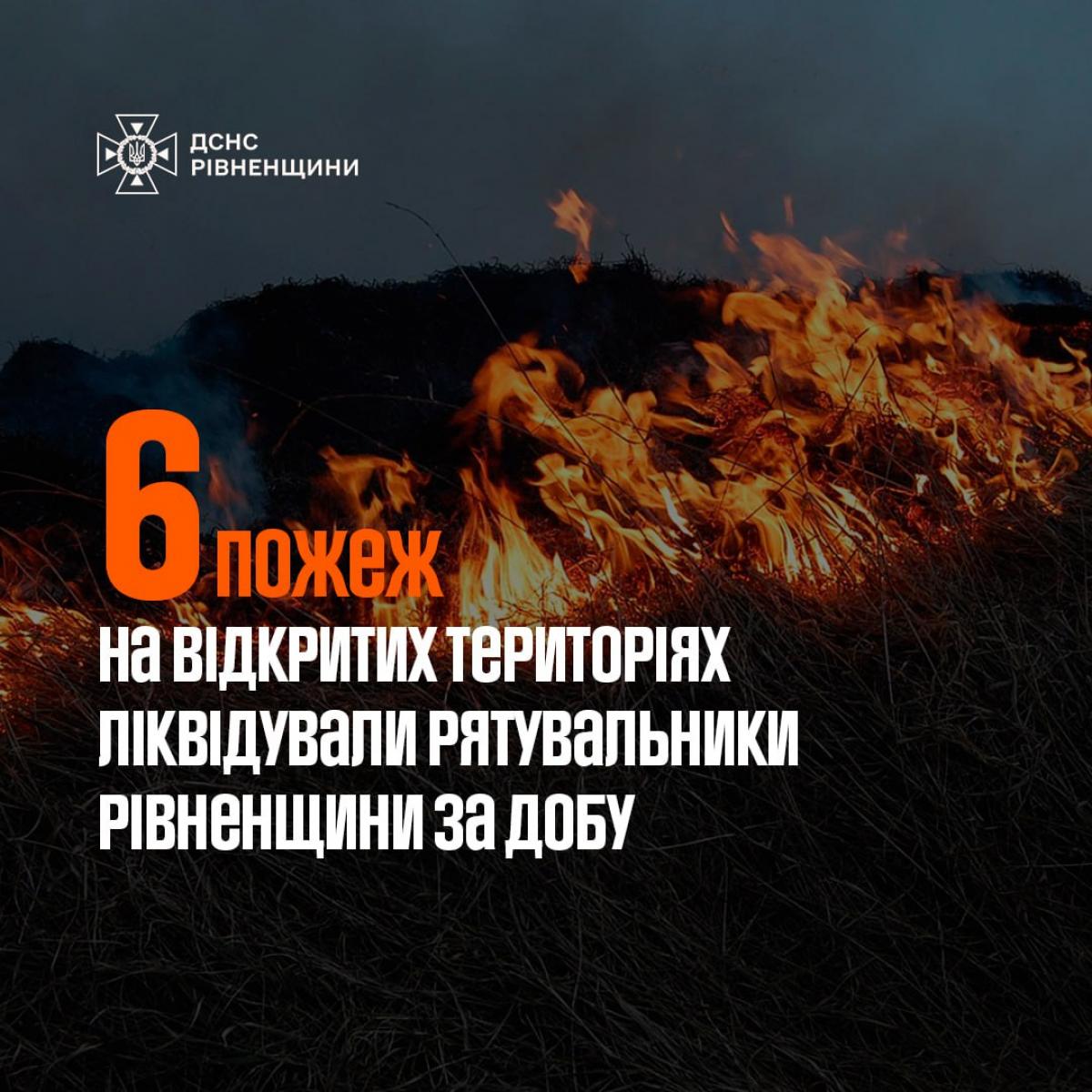 5 вересня зафіксували пожежі у кількох населених пунктах області. У селі Малий Олексин, поблизу вулиці Польової, зайнялася суха трава на площі 0,12 га. У селі Головин загорілася суха трава на площі 0,3 га. У селі Серники Зарічненської громади Вараського району виникло загоряння сухої трави на площі 0,2 га. Пізніше того ж дня поблизу села Млинок у Вараському районі загорілося сміття на площі 50 м², а поблизу села Верба Дубенського району — на площі 200 м².