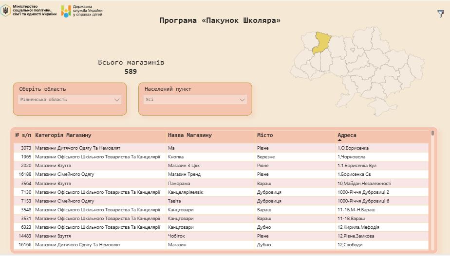 Мінсоцполітики та Державна служба у справах дітей запустили онлайн-дашборд у тестовому режимі. Він допомагає швидко знайти торгові точки, де доступна оплата за програмою. На інтерактивній мапі відображається понад 25 тисяч магазинів по всій Україні, і, з них – 589 на Рівненщині.