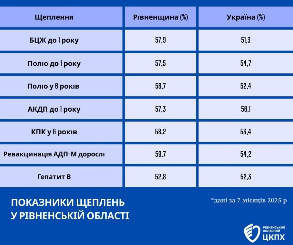 За 7 місяців 2025 року показник вакцинації на Рівненщині становить 55,8% при рекомендованому 58,3%.