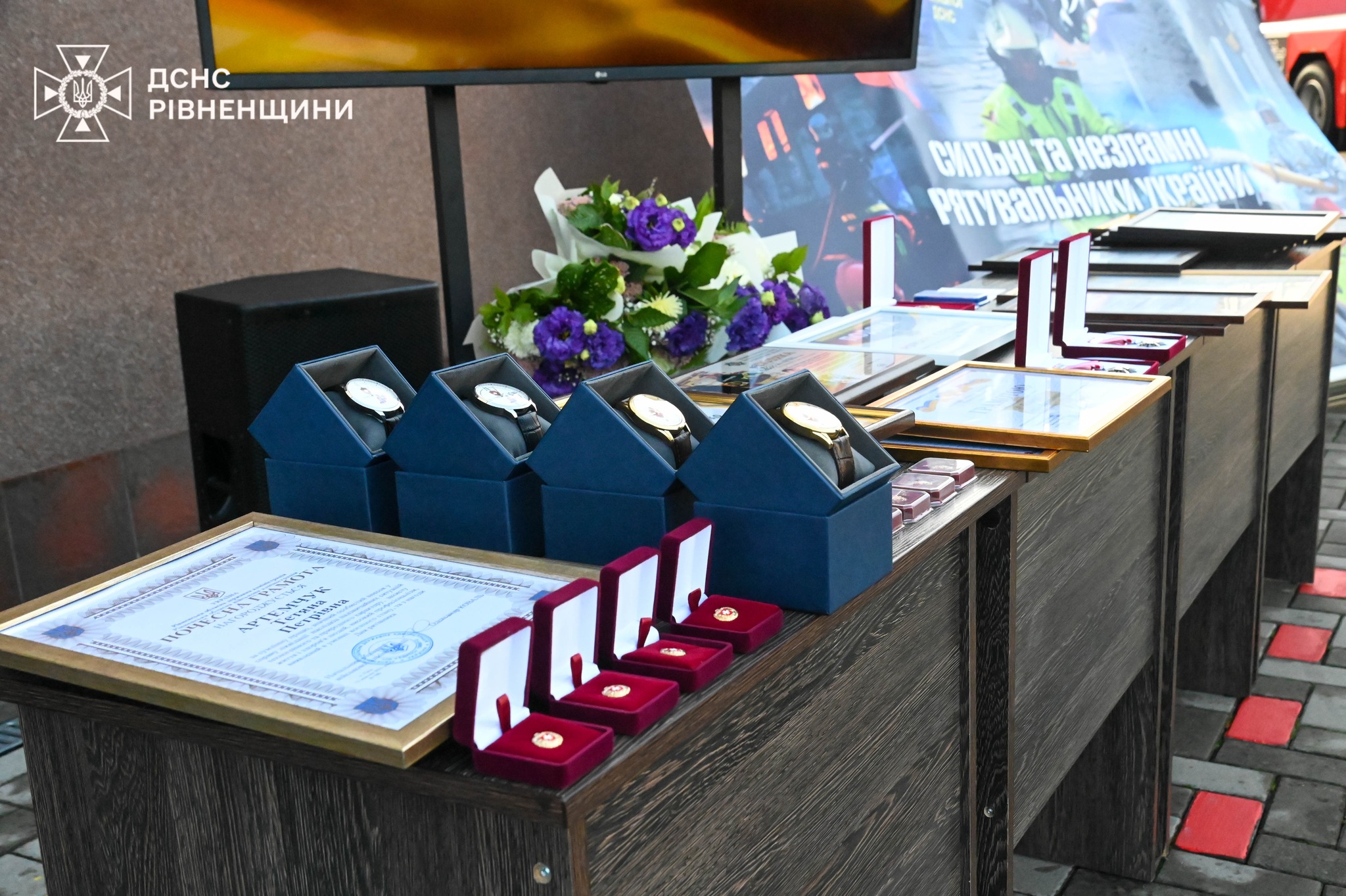 Невід’ємною частиною заходу стало вручення відзнак, грамот та цінних подарунків від керівництва області, міста та представників сил безпеки й оборони кращим працівникам підрозділів ДСНС Рівненщини.