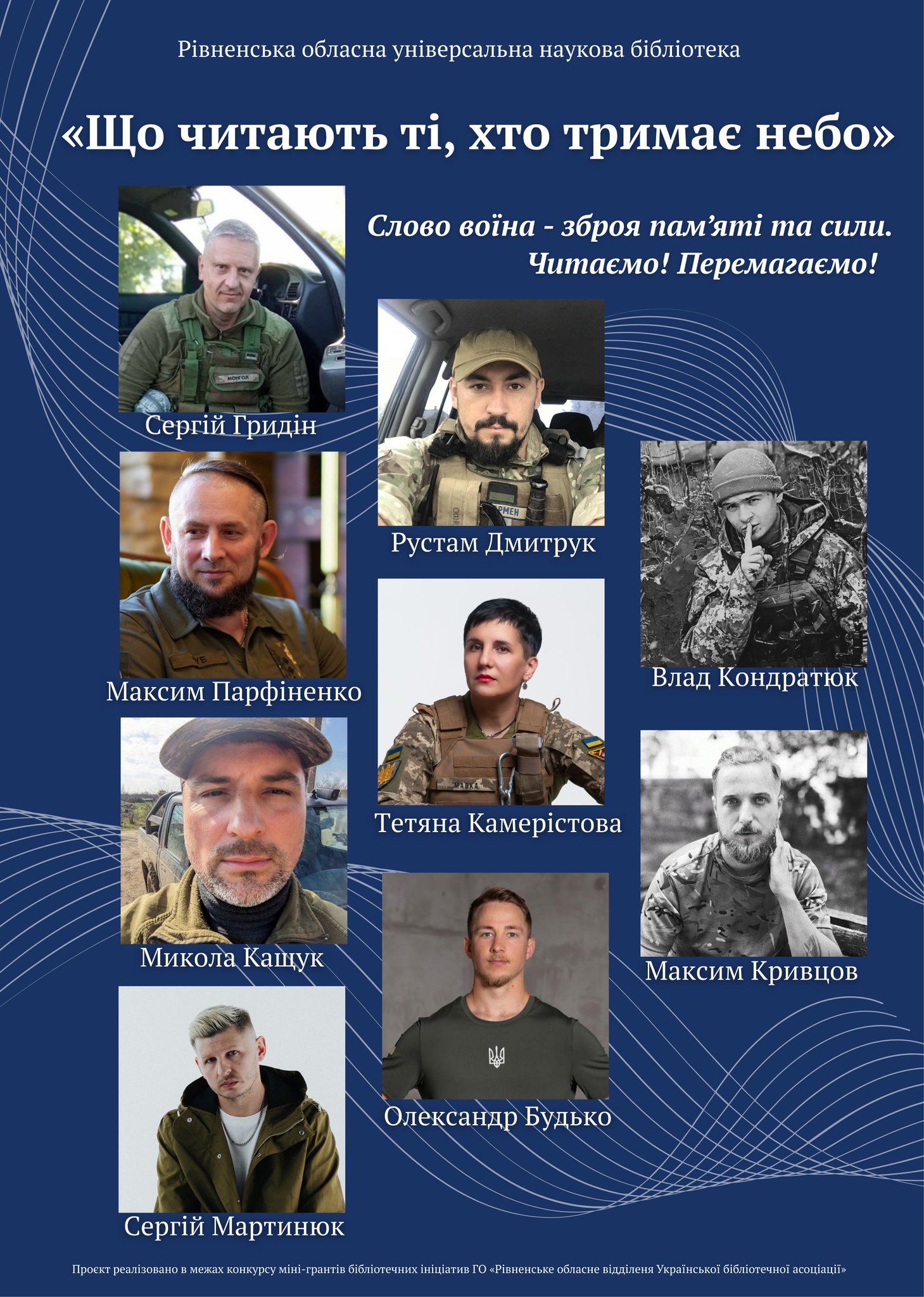 Героями виставки стали уродженці Рівненщини – військовослужбовці, ветерани, які нині боронять Україну. Серед них є й відомі письменники та автори сучасної воєнної прози й поезії: Сергій Гридін, Тетяна Камерістова, Сергій Мартинюк, Максим Парфіненко, Рустам Дмитрук, Микола Кащук, Олександр Будько, Максим Кривцов та Владислав Кондратюк.
