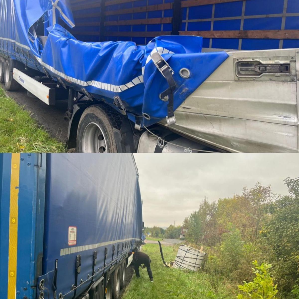 Учора, 9 жовтня, на автодорозі, поблизу Зеленого Гаю, сталася ДТП без травмовних за участю вантажного автомобіля Volvo з напівпричепом Krone.