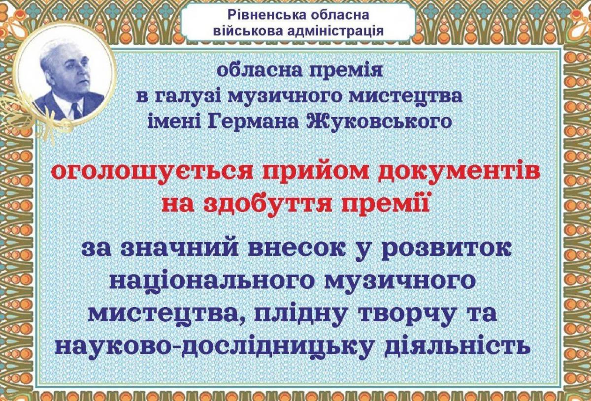 Рівненська ОДА оголосила прийом документів на здобуття у 2025 році обласної премії в галузі музичного мистецтва імені Германа Жуковського.