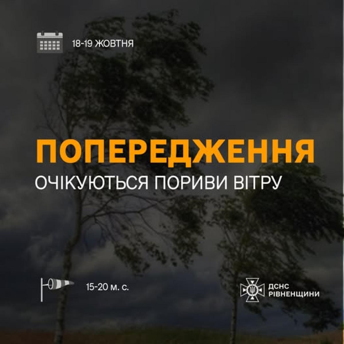 За інформацією Рівненського обласного центру з гідрометеорології,18 та 19 жовтня у Рівному та області очікуються пориви північно-західного вітру 15–20 м/с.
