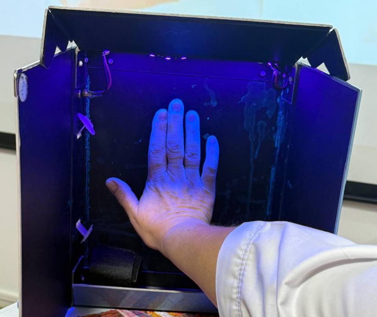 Під час навчання застосовують УФ-тренажер, який за допомогою ультрафіолетових променів допомагає визначити якість обробки рук.