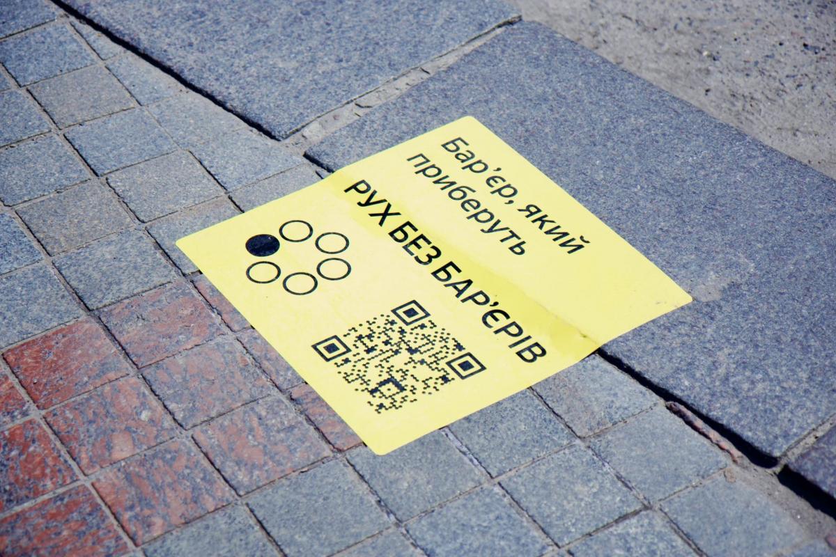 Жовта наліпка «Бар’єр, який приберуть» на тротуарі в межах ініціативи «Рух без бар’єрів».