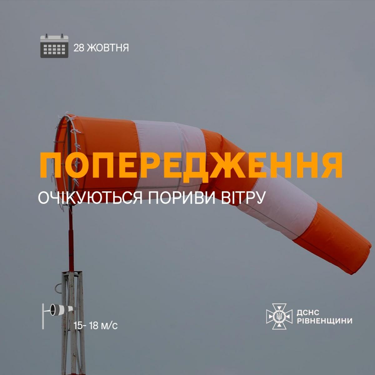 За даними Рівненського обласного центру з гідрометеорології, 28 жовтня вранці та вдень у Рівному та області очікуються пориви південно-західного вітру 15–18 м/с.