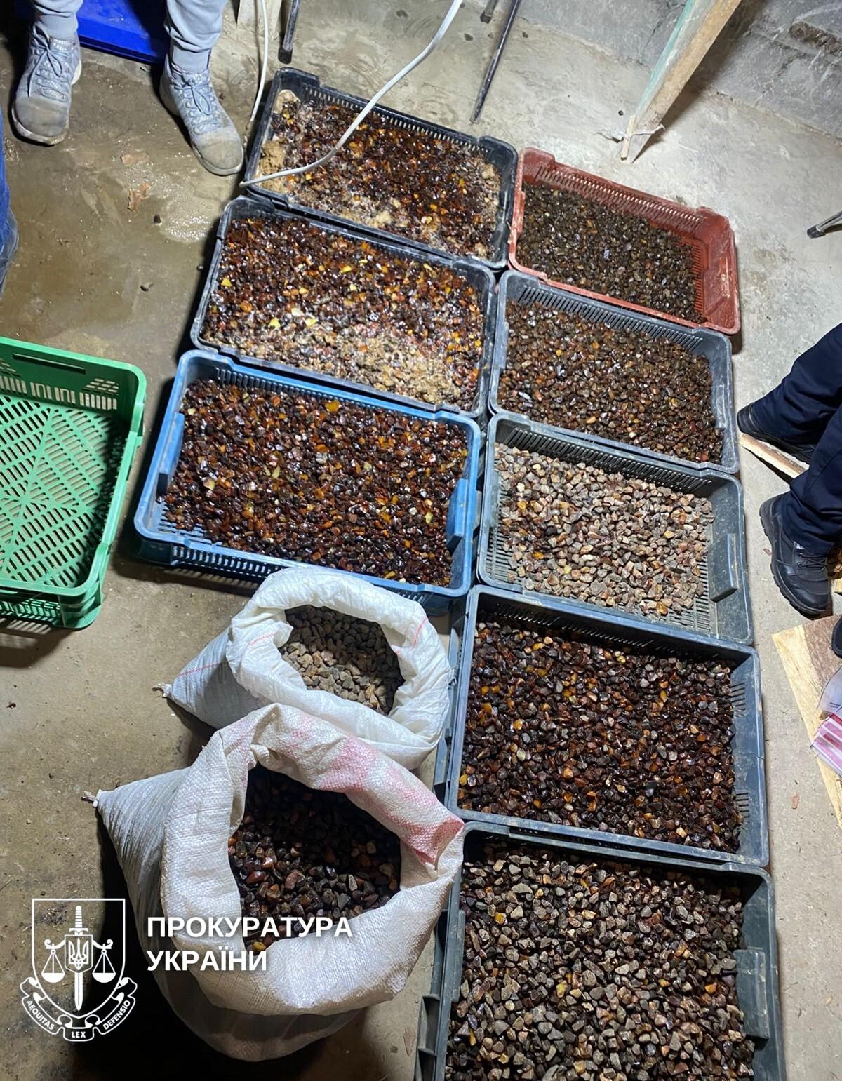 Під час обшуків у зловмисників вилучили майже 450 кг бурштину. Його вартість, згідно з результатами експертизи, перевищує 1,3 млн грн. На вилучене каміння накладено арешт.