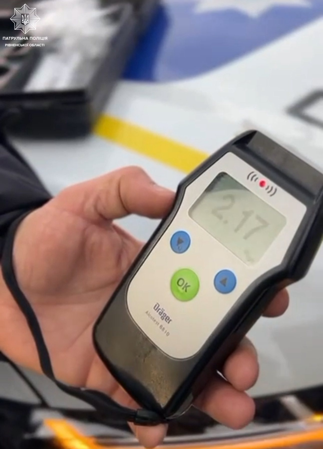 У керманича дійсно були ознаки алкогольного сп'яніння, тому поліцейські запропонували йому пройти огляд за допомогою алкотестера. Результат огляду позитивний: 2,17 проміле.
