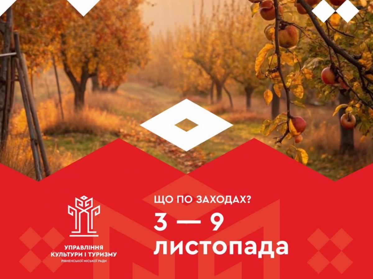 Рівнян та гостей міста запрошують на загальноміські заходи, які будуть відбуватися у Рівненській міській територіальній громаді на період з 3 – 9 листопада. Протягом цього тижня на вас чекає безліч цікавих подій, заходів, майстер-класів, виставок, тощо.