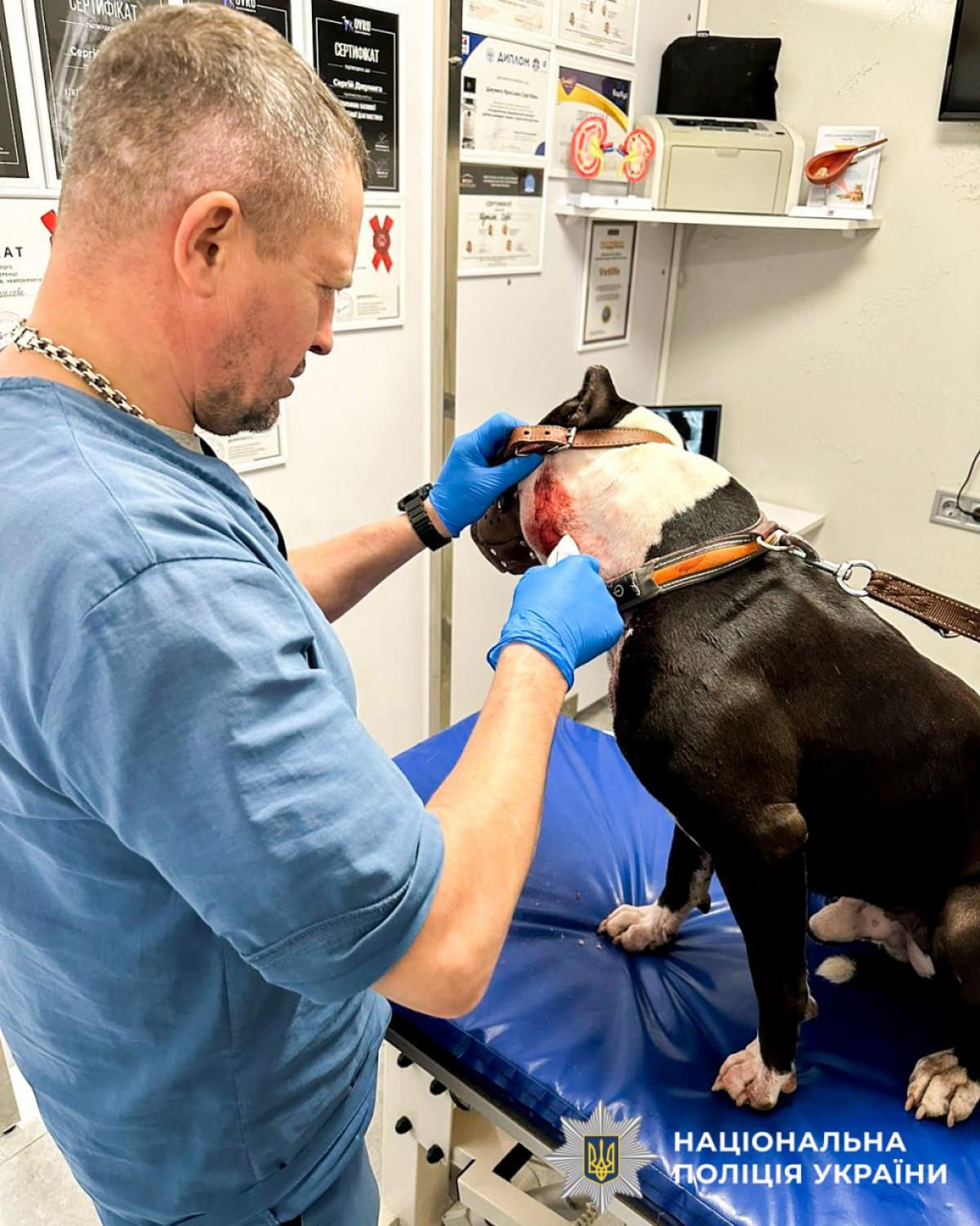 Закривавленого та змореного стафф-тер’єра виявило керівництво ВП №1 (м. Рівне), яке також прибуло на місце події. Чотирилапого негайно відвезли до ветклініки, де діагностували три колото-ріжучі рани, глибиною 1-3 см в області грудопоперекового відділу.