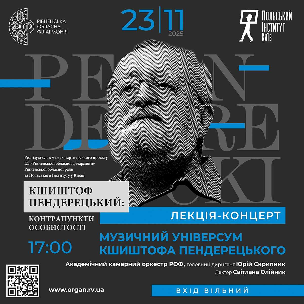 Завершиться проєкт 23 листопада о 17:00 лекцією-концертом «Музичний універсум Кшиштофа Пендерецького» за участі Академічного камерного оркестру Рівненської обласної філармонії.