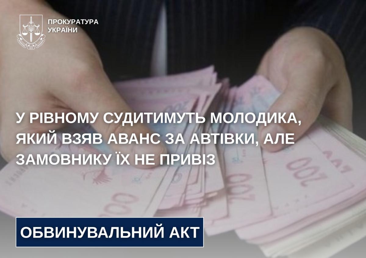 Прокурори Рівненської окружної прокуратури скерували до суду обвинувальний акт стосовно 23-річного рівнянина. Йому інкримінують шахрайство, вчинене в умовах воєнного стану, що завдало значної шкоди потерпілому (ч. 3 ст. 190 КК України). Наразі своєї вини обвинувачений не визнає.