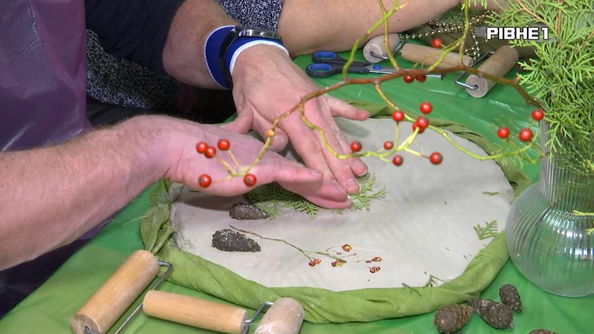 Рівнянин Дмитро створює композицію з натуральних матеріалів. Чоловік з народження має 1% зору. Тож свою композицію він бачить на дотик.