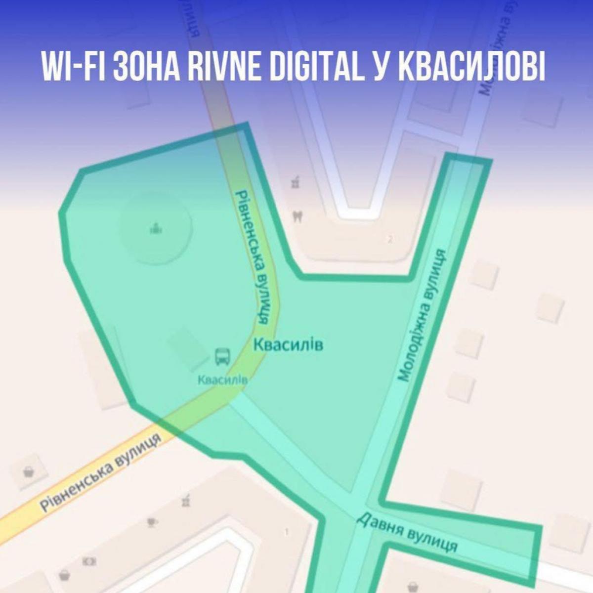 У центрі селища Квасилів створено нову зону безплатного Wi-Fi, що охоплює територію на перетині вулиць Молодіжна та Рівненська. Щоб під'єднатися можна до мережі RivneDigital — просто оберіть її у списку доступних мереж.