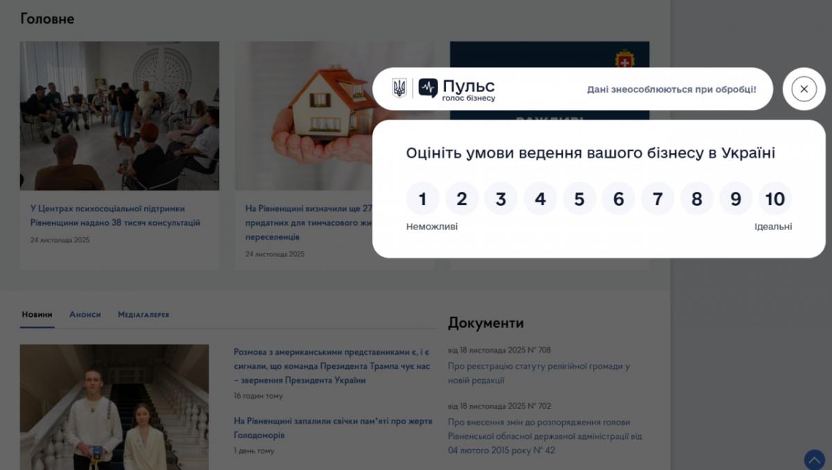 На сайті Рівненської ОДА запрацював віджет платформи «Пульс». Він дозволяє комунікацію підприємців з державою зробити простішою, швидшою та прозорішою", - йдеться в повідомленні.
