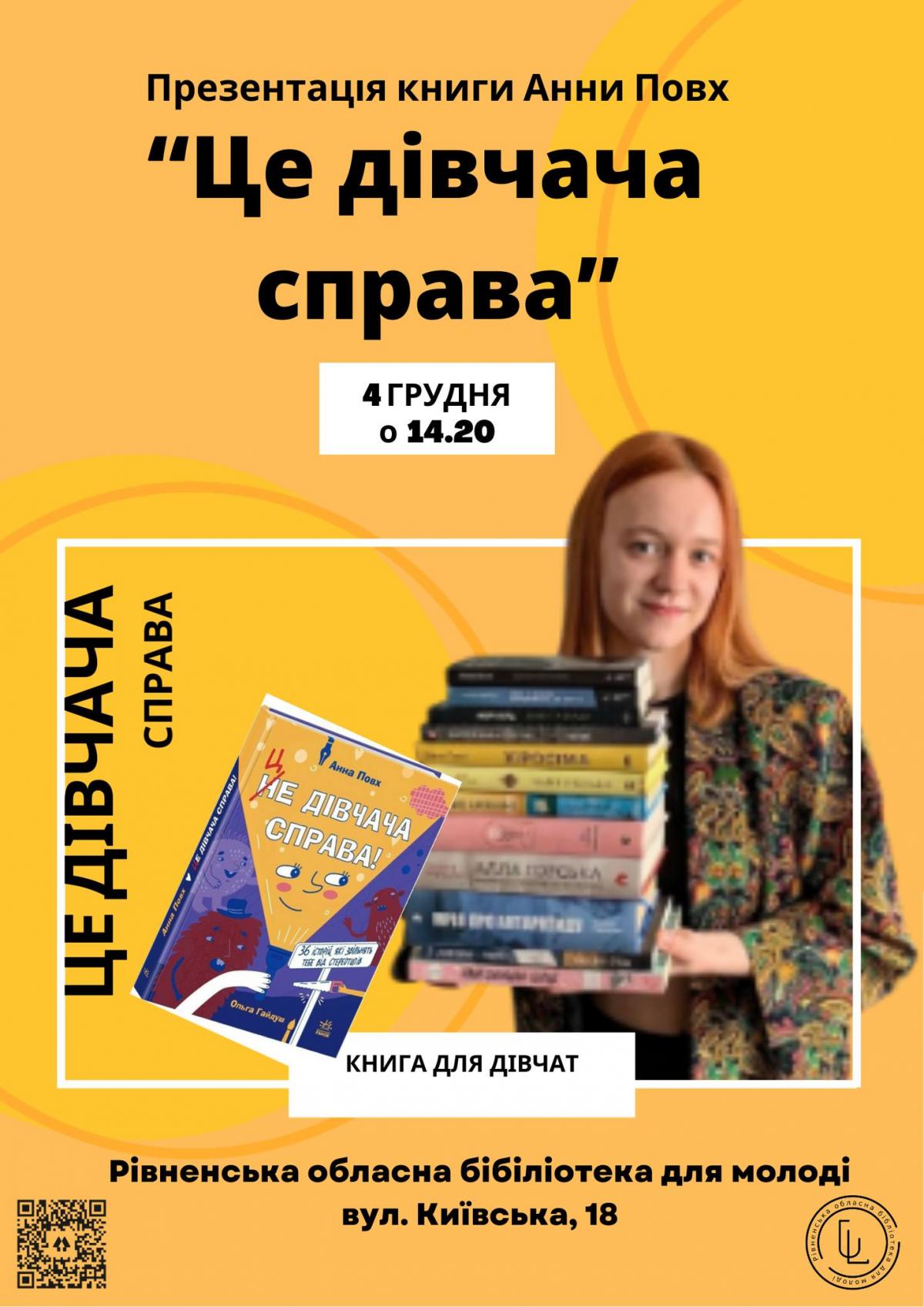 4 грудня о 14:20 у відділі сімейного читання Рівненської обласної бібліотеки для молоді відбудеться зустріч–презентація книги нашої землячки – письменниці з Рівненщини Анни Повх.