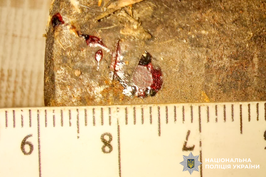 Під час санкціонованого обшуку за місцем проживання фігуранта поліцейські виявили та вилучили закривавлений ніж, молоток та корпус грати «Ф-1» із запалом до неї.