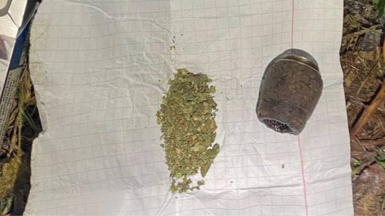 У кишені куртки поліцейські виявили пластмасову коробку з пристроєм для куріння з нашаруванням бурого кольору, а в пачці з-під цигарок — подрібнену речовину рослинного походження, зовні схожу на наркотичну.