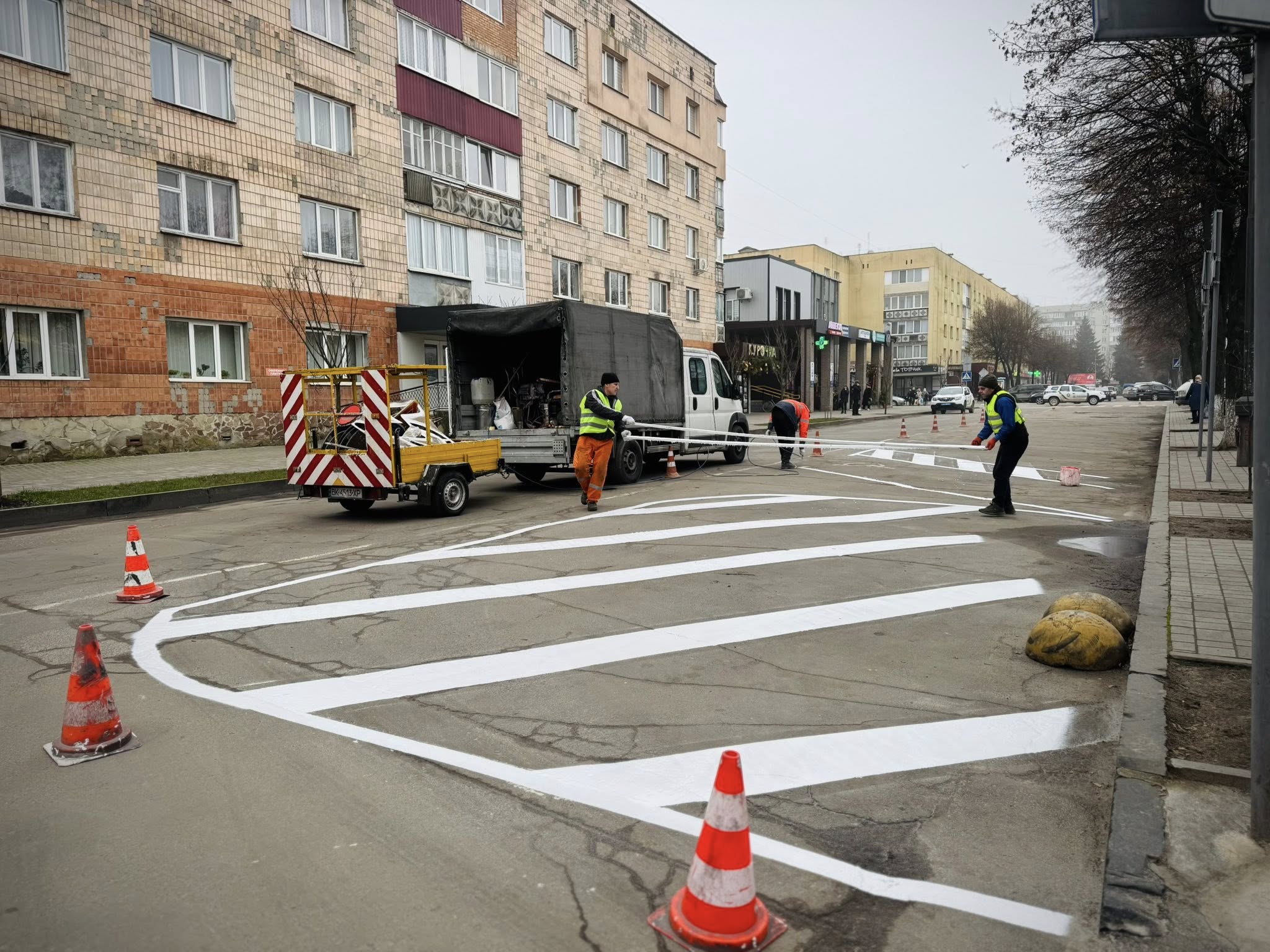 Існуючу «зебру» демонтували, а новий пішохідний перехід облаштовано ближче до кільця. Це зроблено для підвищення безпеки та впорядкування руху на цій ділянці дороги.