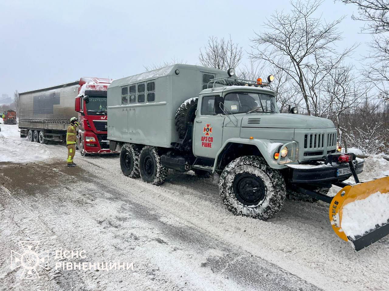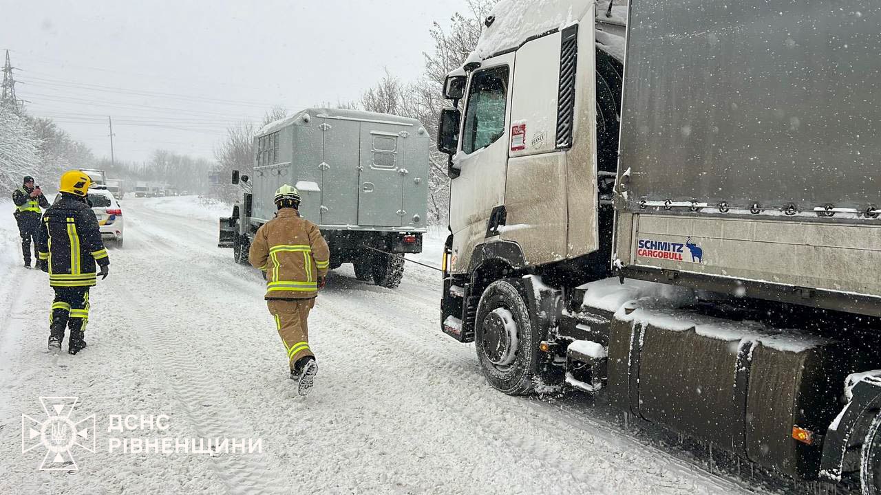 Сьогодні, 8 січня, о 15:00 рятувальники ДСНС Рівненщини за допомогою спеціальної інженерної техніки надавали допомогу в буксируванні зі снігових заметів чотирьох вантажних автомобілів, які опинилися у сніговій пастці поблизу села Бармаки Шпанівської сільської громади Рівненського району.