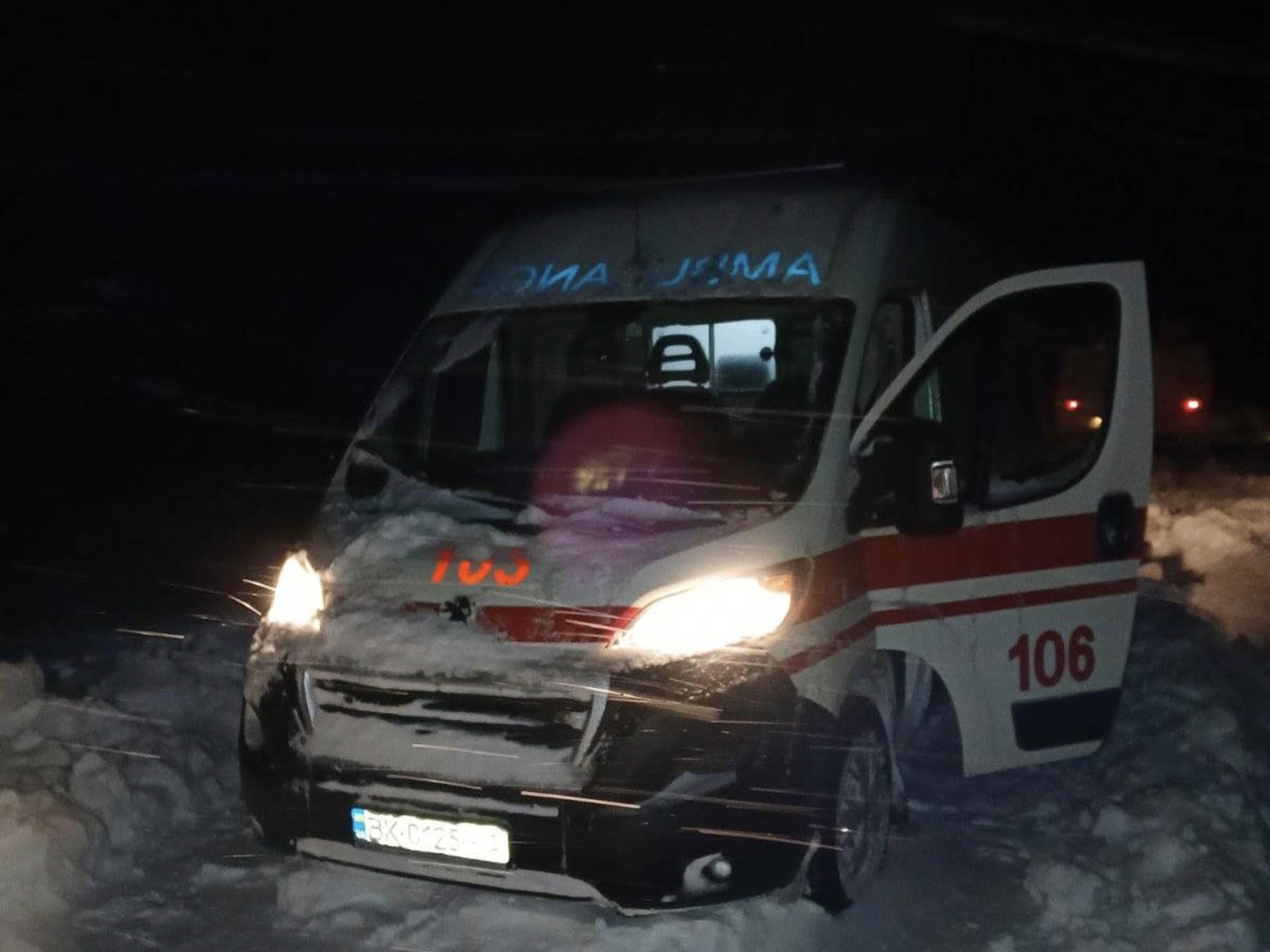 9 січня о 01:21 до Служби порятунку надійшло повідомлення про те, що поблизу села Білятичі Сарненського району карета швидкої медичної допомоги потрапила у сніговий замет. Через складні погодні умови автомобіль не міг самостійно продовжити рух.