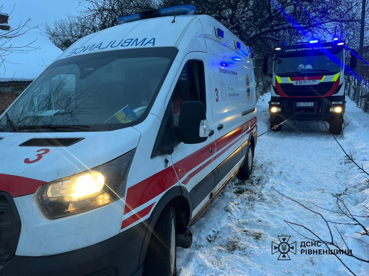 Вчора близько 16:00 у селі Городище Рівненського району по вулиці Садовій рятувальники надали допомогу з буксирування карети швидкої медичної допомоги, яка застрягла у сніговому заметі.