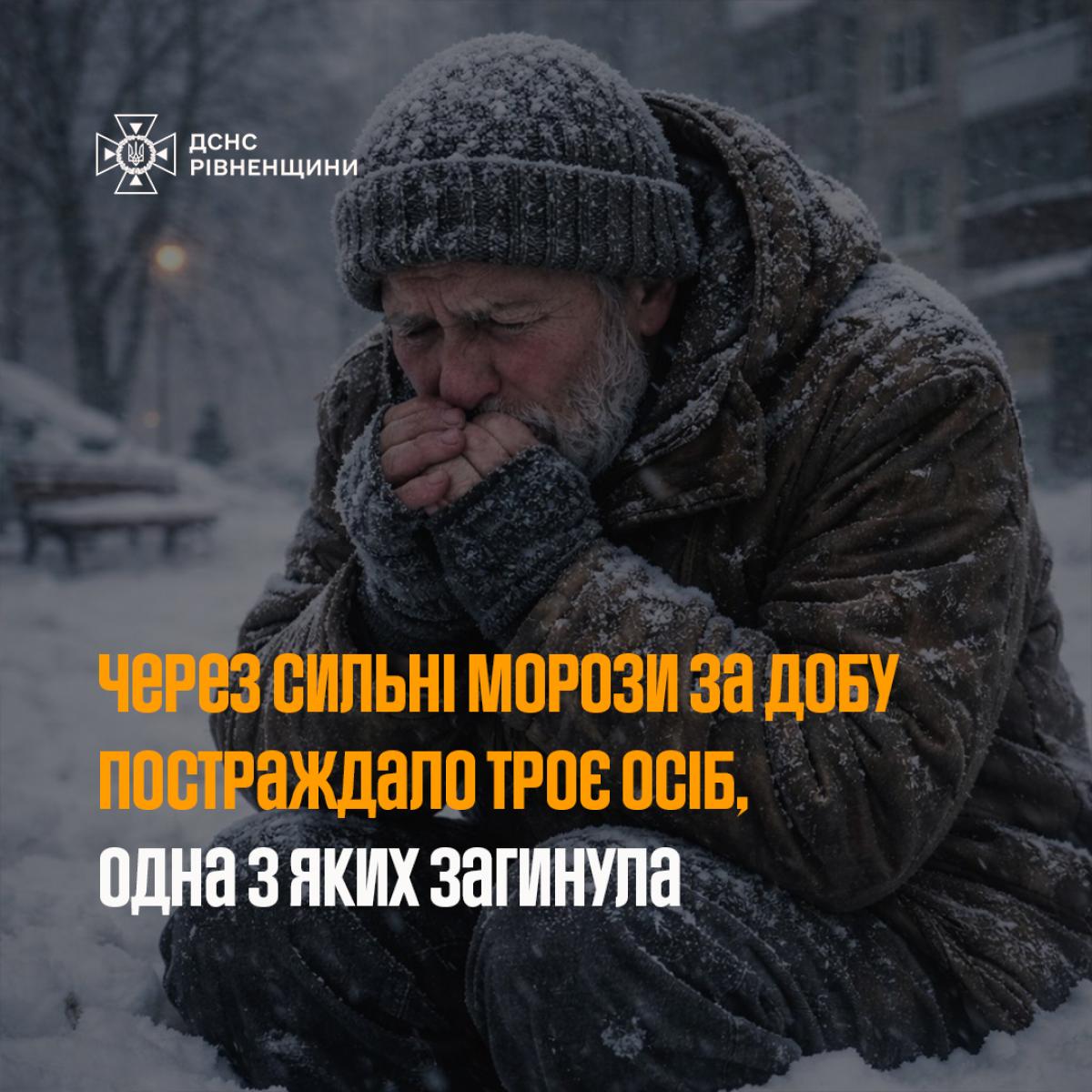 31 січня на території Рівненської області зафіксовано три випадки переохолодження та обмороження громадян, унаслідок яких двох осіб було госпіталізовано, ще одна людина, на жаль, померла.