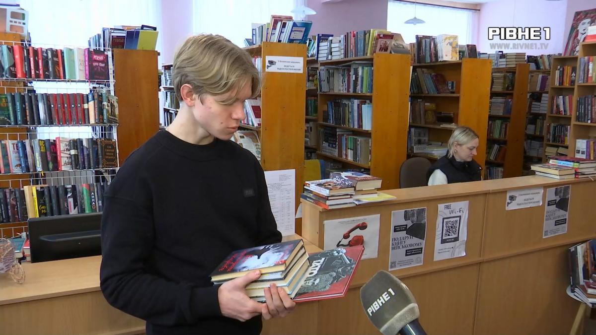 Олександр приніс Рівненській обласній бібліотеці для молоді декілька книг із домашньої колекції. Їх збирають тут для поранених захисників.