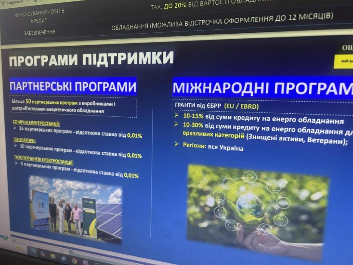 Представник Ощадбанку поінформував про програми кредитування для забезпечення енергетичної безпеки та енергоефективності підприємств з переробки аграрної продукції. Зокрема, у лютому держава запустила нові інструменти підтримки: безповоротну допомогу для ФОП та пільгове кредитування під 0% річних на придбання енергетичного обладнання в межах програми «Доступні кредити 5-7-9%». Кредит надається строком до 3 років на суму до 10 млн грн для мікро-, малого та середнього бізнесу. Податися можна через банки-учасники програми, а рішення щодо надання позики ухвалює банк.