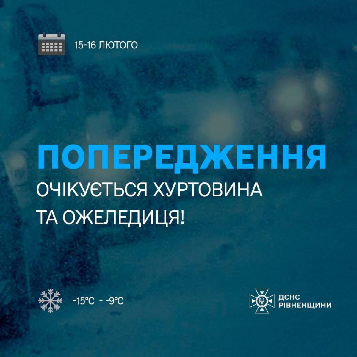 За інформацією Рівненського обласного центру з гідрометеорології, 15 лютого, у другій половині дня, а також вночі та вранці 16 лютого, у м. Рівне та на території Рівненської області очікується хуртовина.