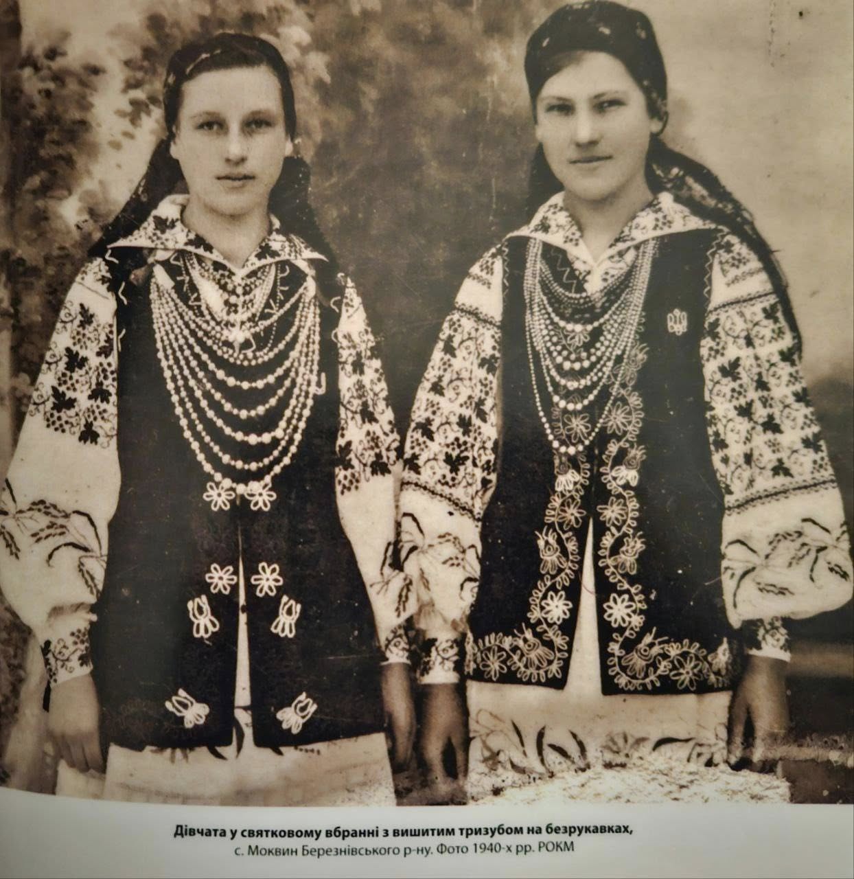 Фото 1940-х років українських дівчат з села Моквин на Березнівщині, одягнених у святковий одяг, серед елементів якого є вишитий тризуб.