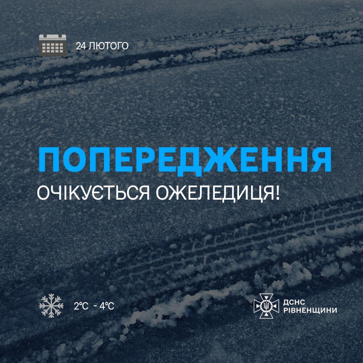 За інформацією Рівненського обласного центру з гідрометеорології, 24 лютого на території Рівненської області та в місті Рівному на дорогах збережеться ожеледиця.