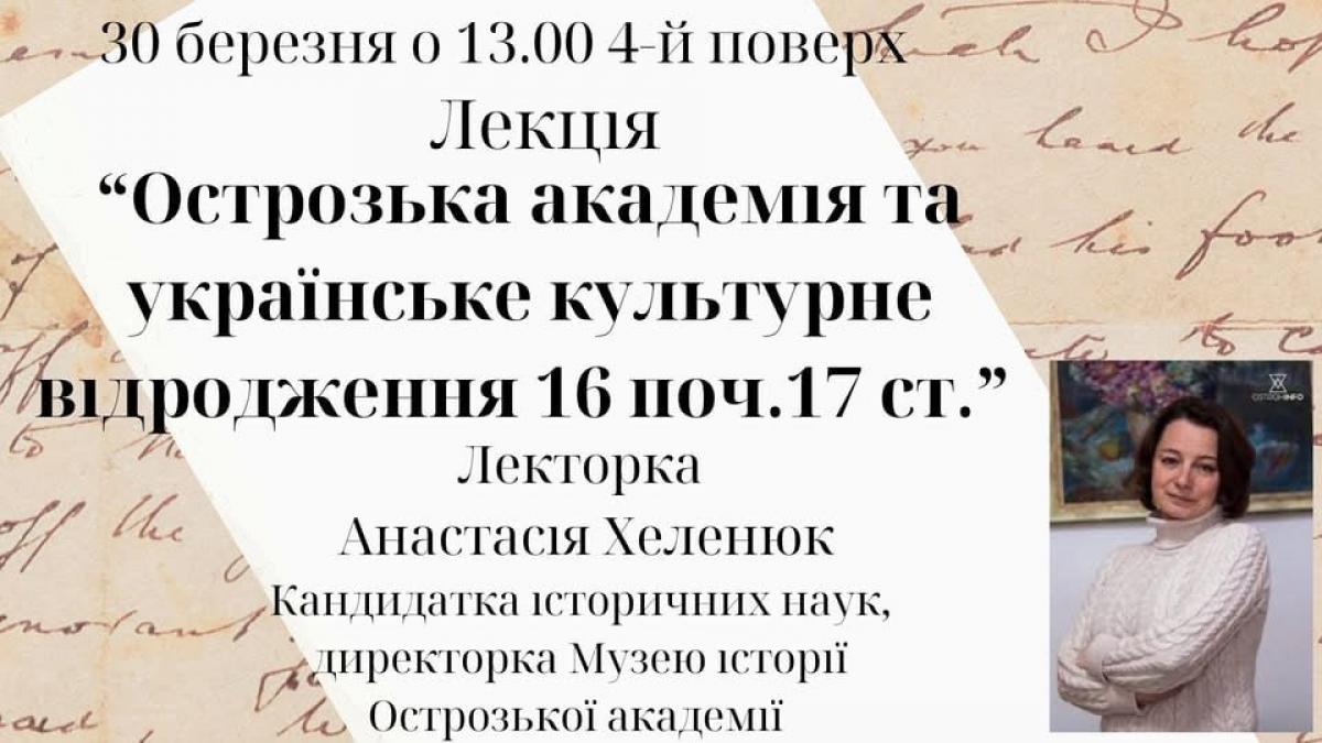 Лекцію прочитає Анастасія Хеленюк — кандидатка історичних наук, директорка Музею історії Національного університету «Острозька академія».