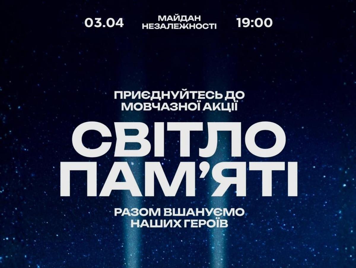Так, 3 квітня, о 19:00 на майдані Незалежності біля портретів полеглих воїнів у небо здіймуться світлові промені – як символ вічної вдячності та шани.