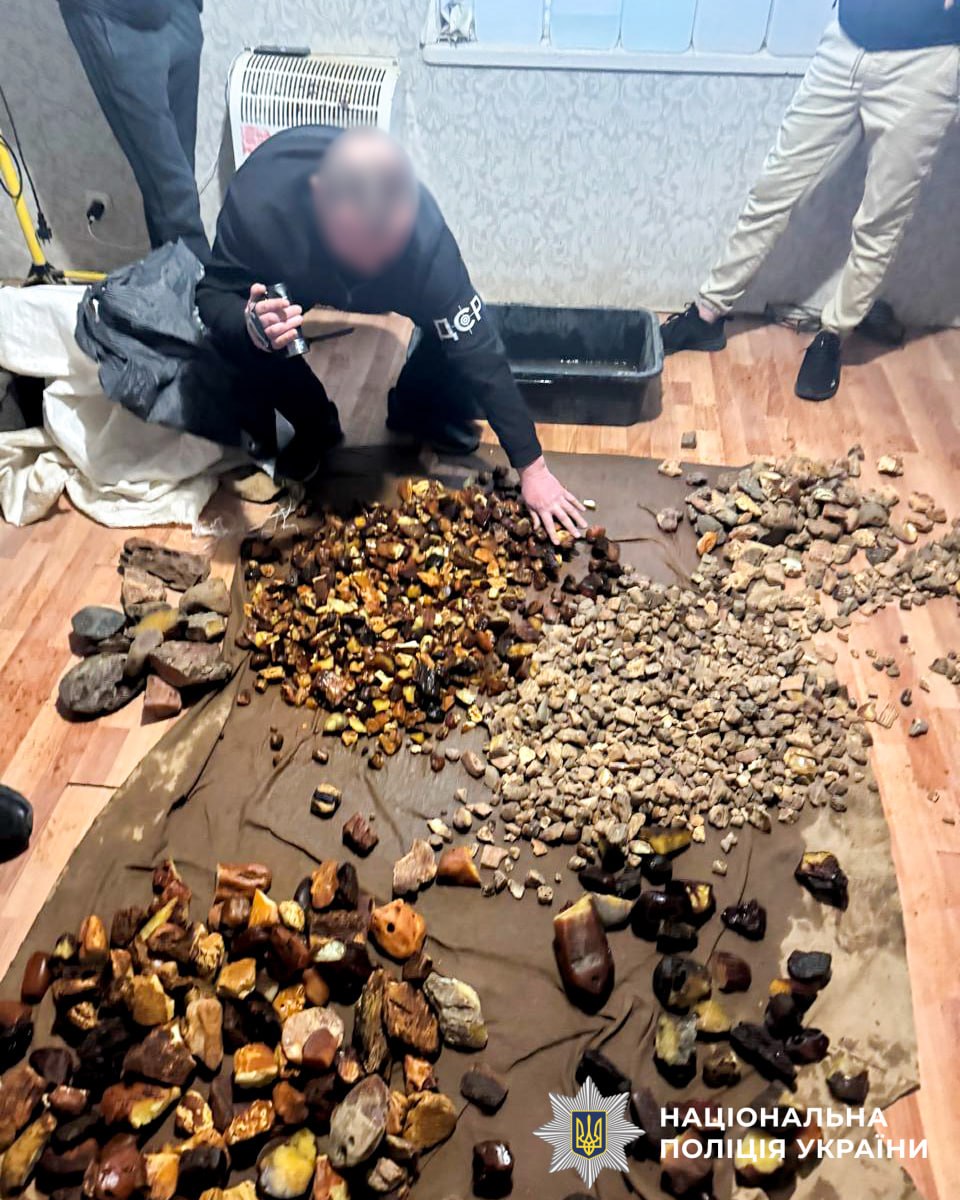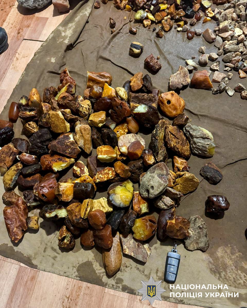 У межах відкритого кримінального провадження за ч.2 ст.240-1 КК України (незаконне видобування, збут, придбання, передача, пересилання, перевезення, переробка бурштину) поліцейські провели обшуки під час яких вилучили понад 80 кілограмів «сонячного» каміння, знаряддя для його обробки, електронні ваги, мобільні телефони та автівку.