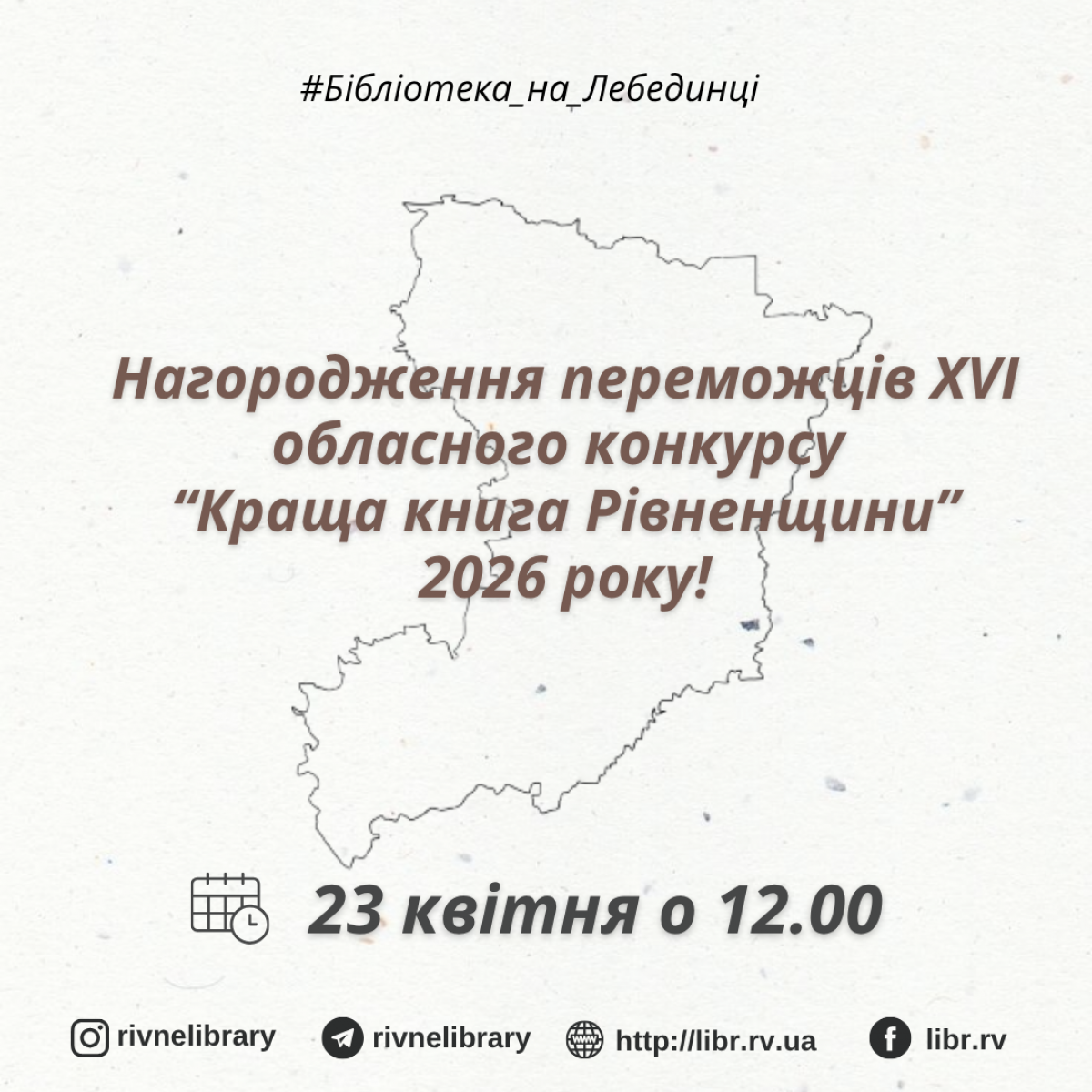 23 квітня о 12:00 на урочистості з нагоди відзначення переможців XVI щорічного обласного конкурсу «Краща книга Рівненщини»! У десяти номінаціях — найкращі з найкращих. Переможців визначило авторитетне журі, до складу якого увійшли науковці, письменники, митці, знані культурні та громадські діячі Рівненщини.