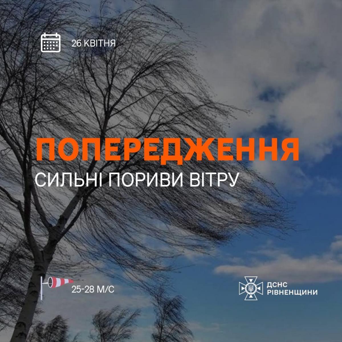 За повідомленням Українського гідрометеорологічного центру, до кінця дня 26 квітня по всій території області очікується значне посилення вітру.