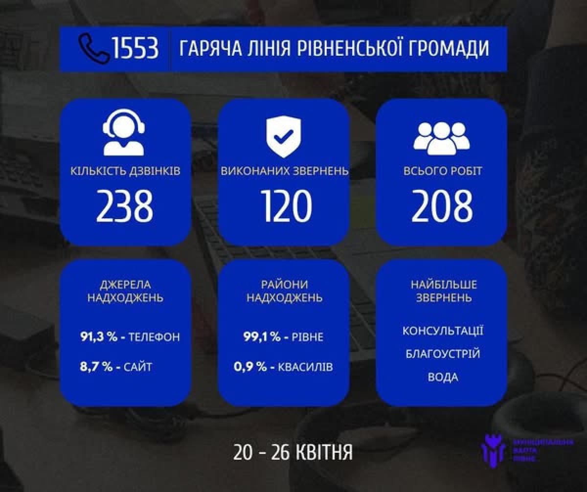У період з 20 по 26 квітня 2026 року наші фахівці відреагували на 238 дзвінків від жителів громади. Було виконано 120 звернення.