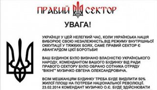 Почали поширювати листівки, підписані «Правим сектором», що координатор «Правого сектора» Олександр Музичко ходитиме по квартирах рівнян та конфісковуватиме половину площ для потреб революції. Власники нібито повинні будуть створити дублікати ключів, бо в їхніх квартирах поселять революціонерів з інших міст, організують там медичні пункти та пункти зброї. Комендантом одного з будинків, де розповсюдили листівки, нібито буде Євген Олександрович Музичко.
