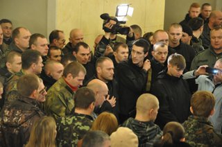 Олександра Музичка побратими винесли з драмтеатру і несуть на руках до Свято-Покровського собору, де незабаром розпочнеться панахида.