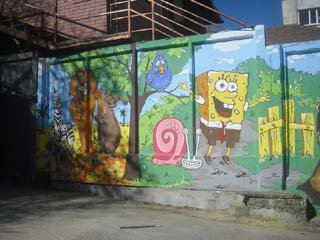На вулиці біля будинку на Степана Бандери, 69/а огородження, яке знаходиться біля дитячого майданчику, розмалювали ось такими симпатичними мультяшними персонажами.