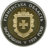 На реверсі монети зображено герб області, по колу розміщено написи: Рівне нська область (угорі), заснована у 1939 році (унизу).