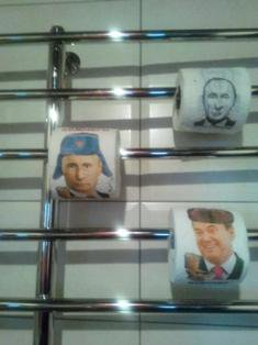 Туалетний папір із зображенням російського президента та колишнього президента України Віктора Януковича можна побачити у одній із вбиралень закладу громадського харчування у Рівному.