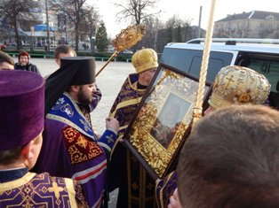 Біля головної брами собору, святиню, яка прибула із Чернігова, зустріло духовенство єпархії на чолі з архієпископом Іларіоном.