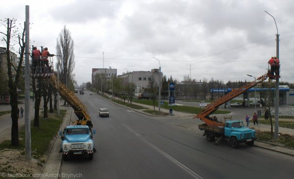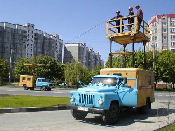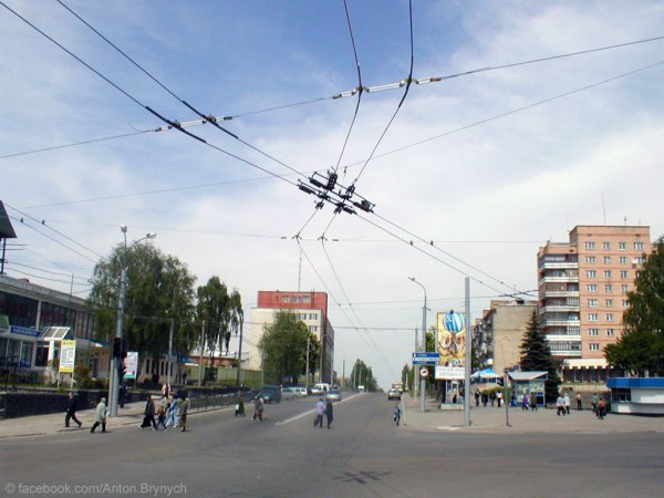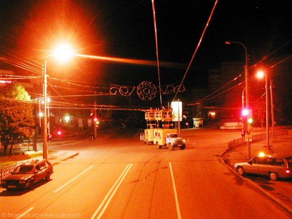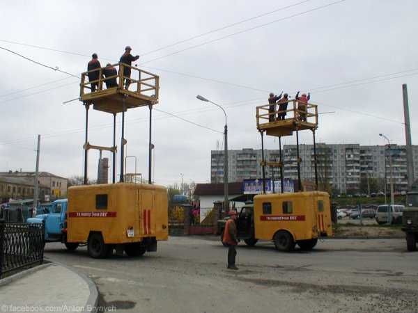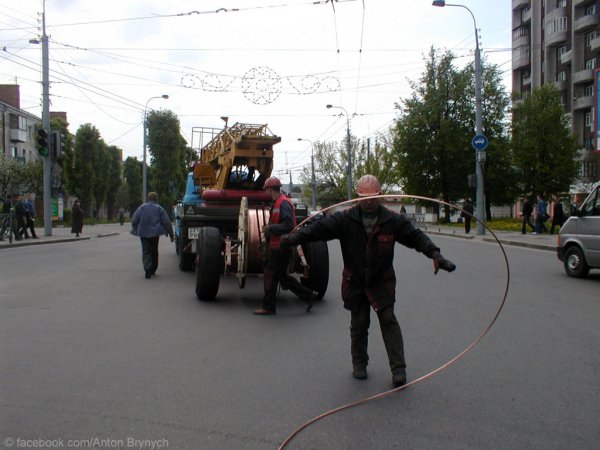16 травня 2005 року. Розкочення контактного дроту на перехресті вулиць Грушевського, Гагаріна та Черняка.